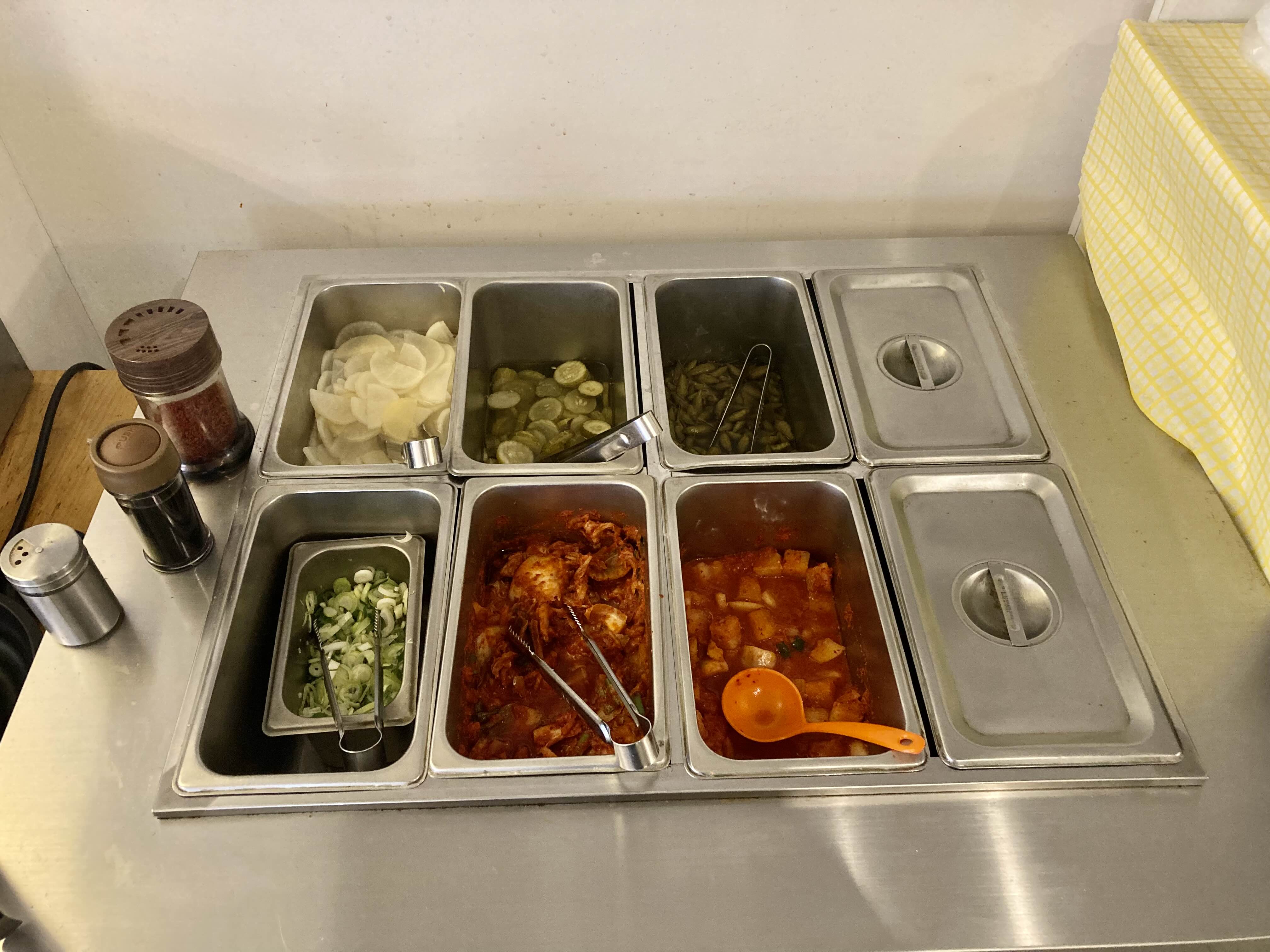 또한, 셀프바를 이용해서 먹고 싶은 반찬을 먹을 만큼 담을 수 있습니다. 특히 셀프 어묵이 탐이 나긴 했어요. 요즘 포장마차에서 파는 어묵들도 꼬치 하나 먹는데 700원은 하더라구요..ㅠㅠ 여기는 꼬치 하나에 500원인 거예요. 하지만 메인 메뉴를 많이 시켜서 어묵은 패스했습니다.