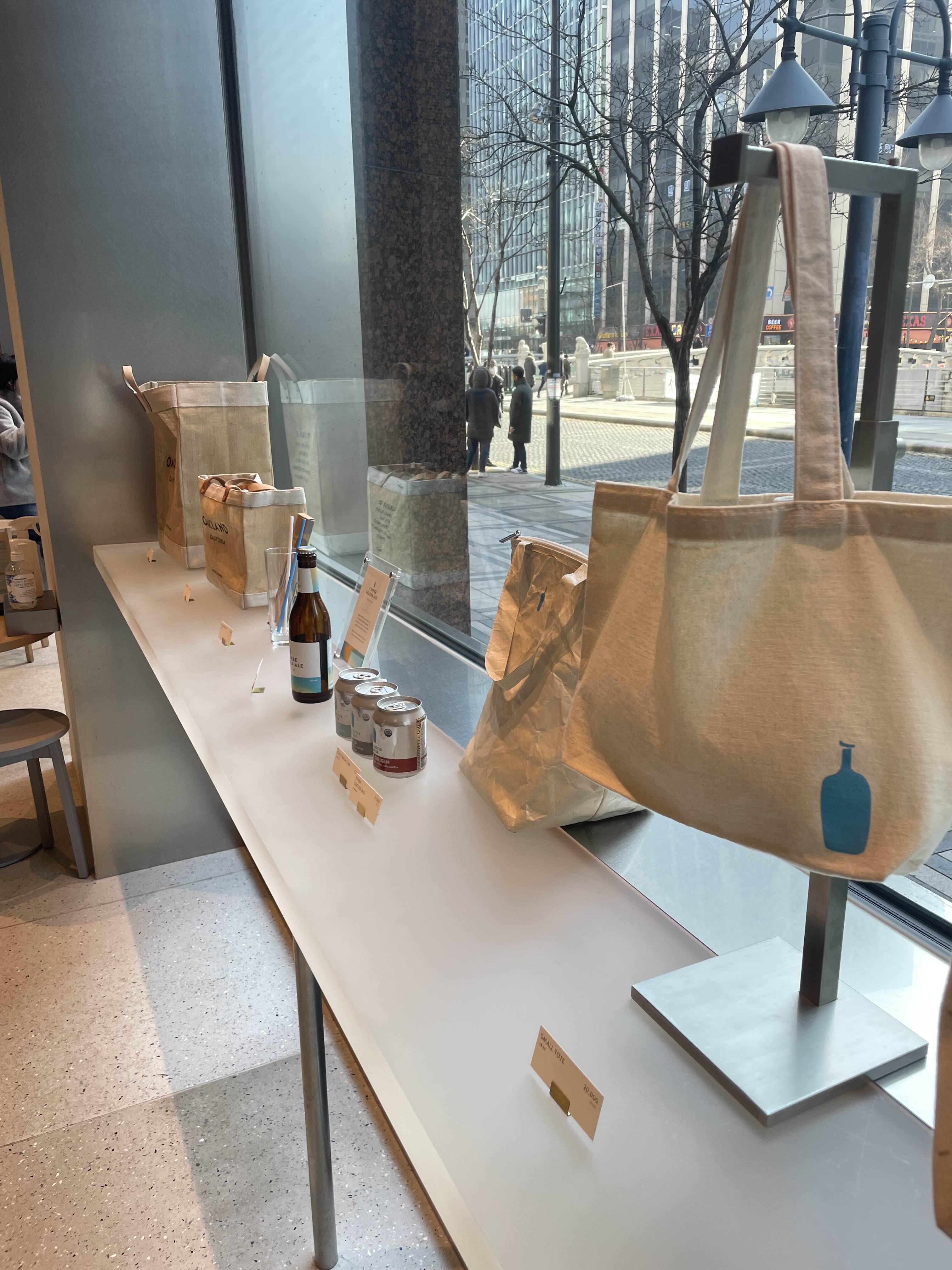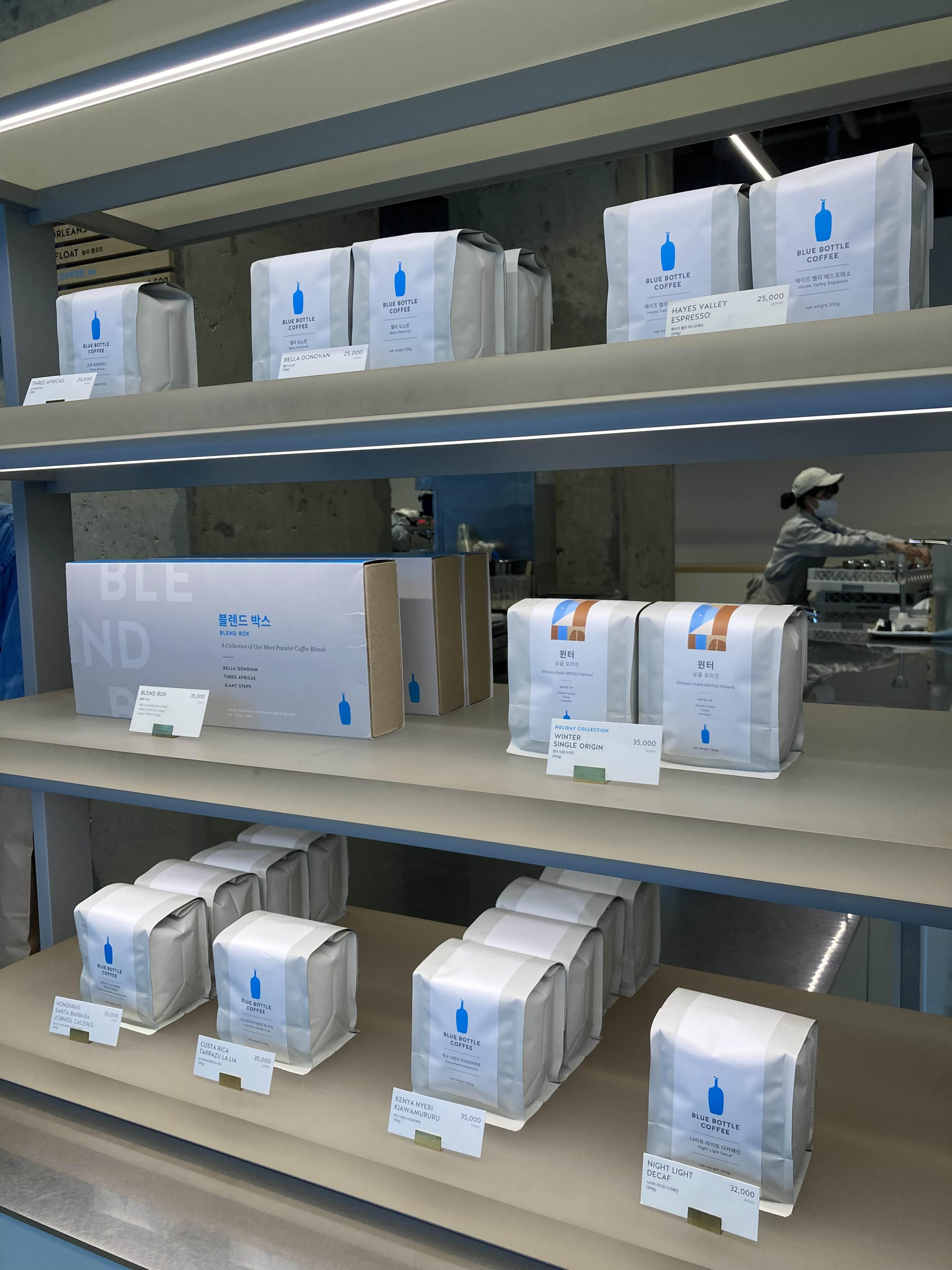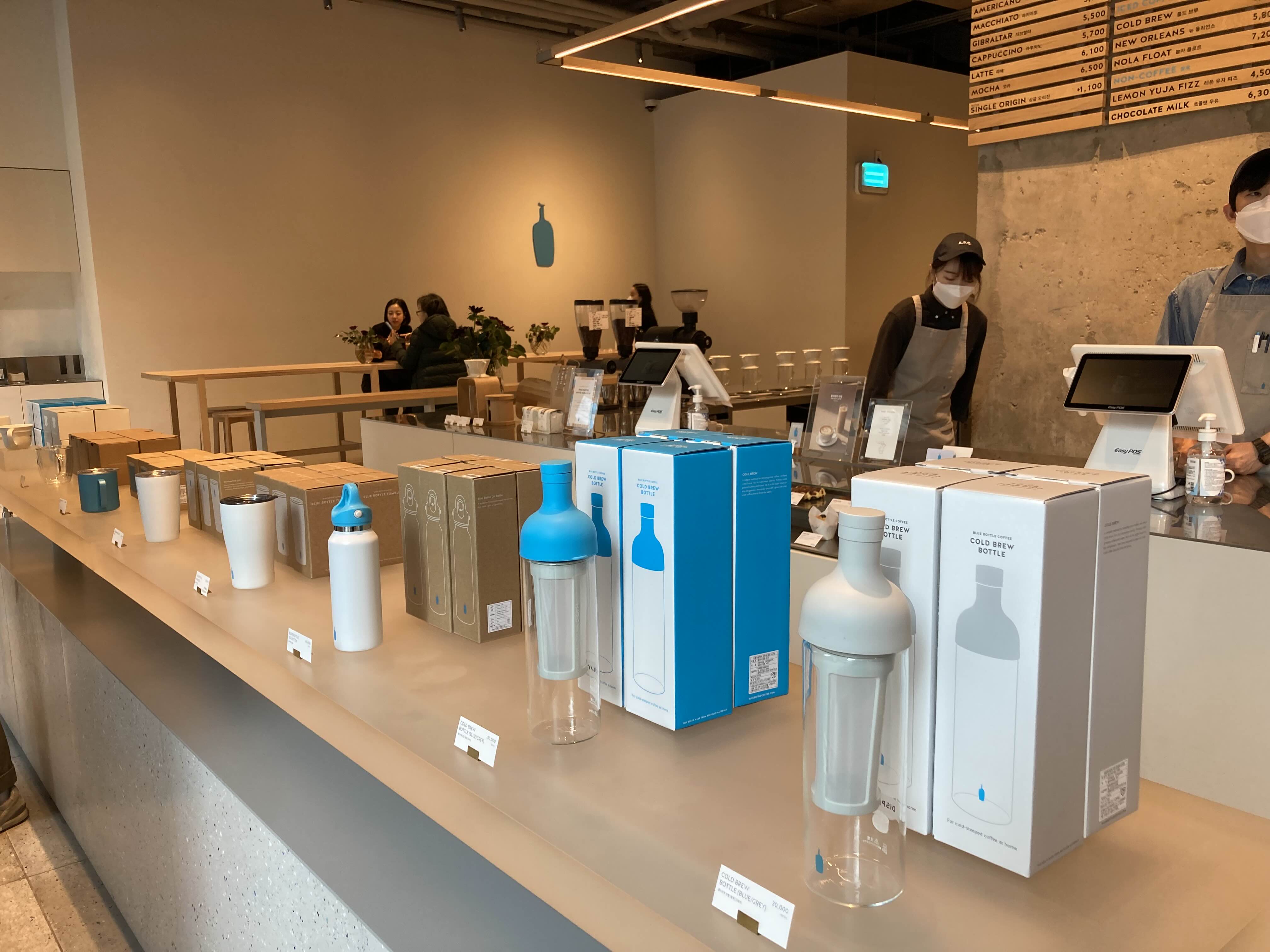 매장에 들어서면 블루보틀 굿즈들과 원두, 커피 주전자들을 볼 수가 있었어요.